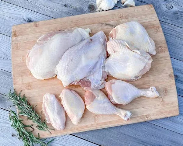 Our all natural meat chickens are pasture raised from about 3 weeks of age , where they spend their days foraging for bugs and grass. Never any hormones, steroids or antibiotics.